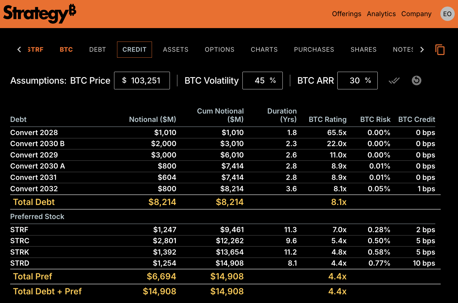 USDat’s first credit product is STRC, Strategy’s second-most-senior perpetual preferred. STRC links directly to Strategy’s Bitcoin-anchored balance sheet and credit operations. It acts as a modern credit instrument while exposing its core metrics - daily collateral reconciliations, live coverage ratios, and total debt obligations - all visible in real time.