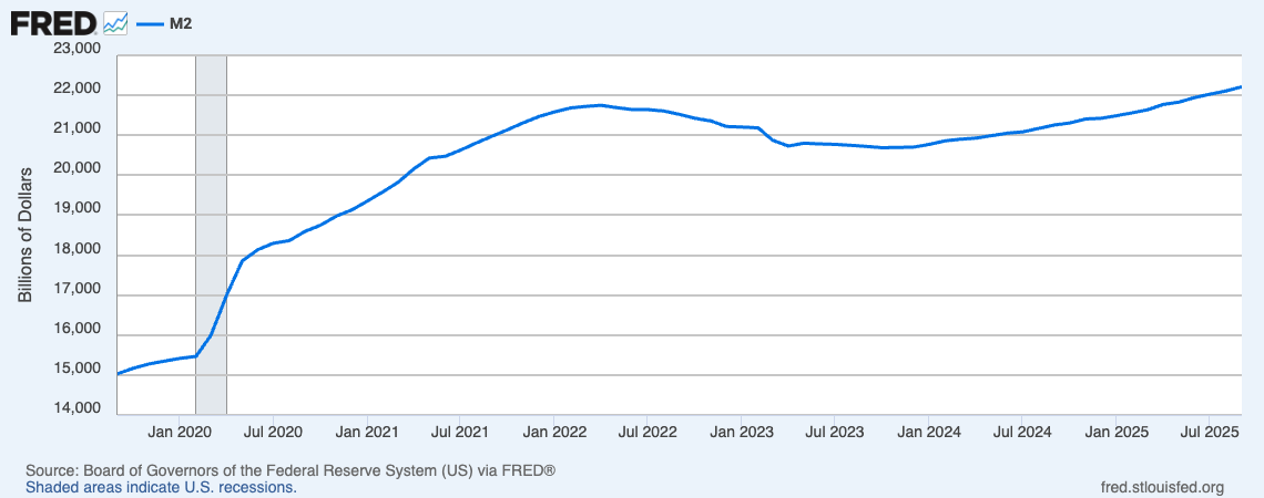 U.S. M2 has expanded from $15 trillion in 2019 to over $21 trillion in 2025 - a 40% increase in circulating money with no corresponding rise in productivity or real wages. In effect, more dollars are chasing the same output, inflating asset prices while eroding purchasing power.